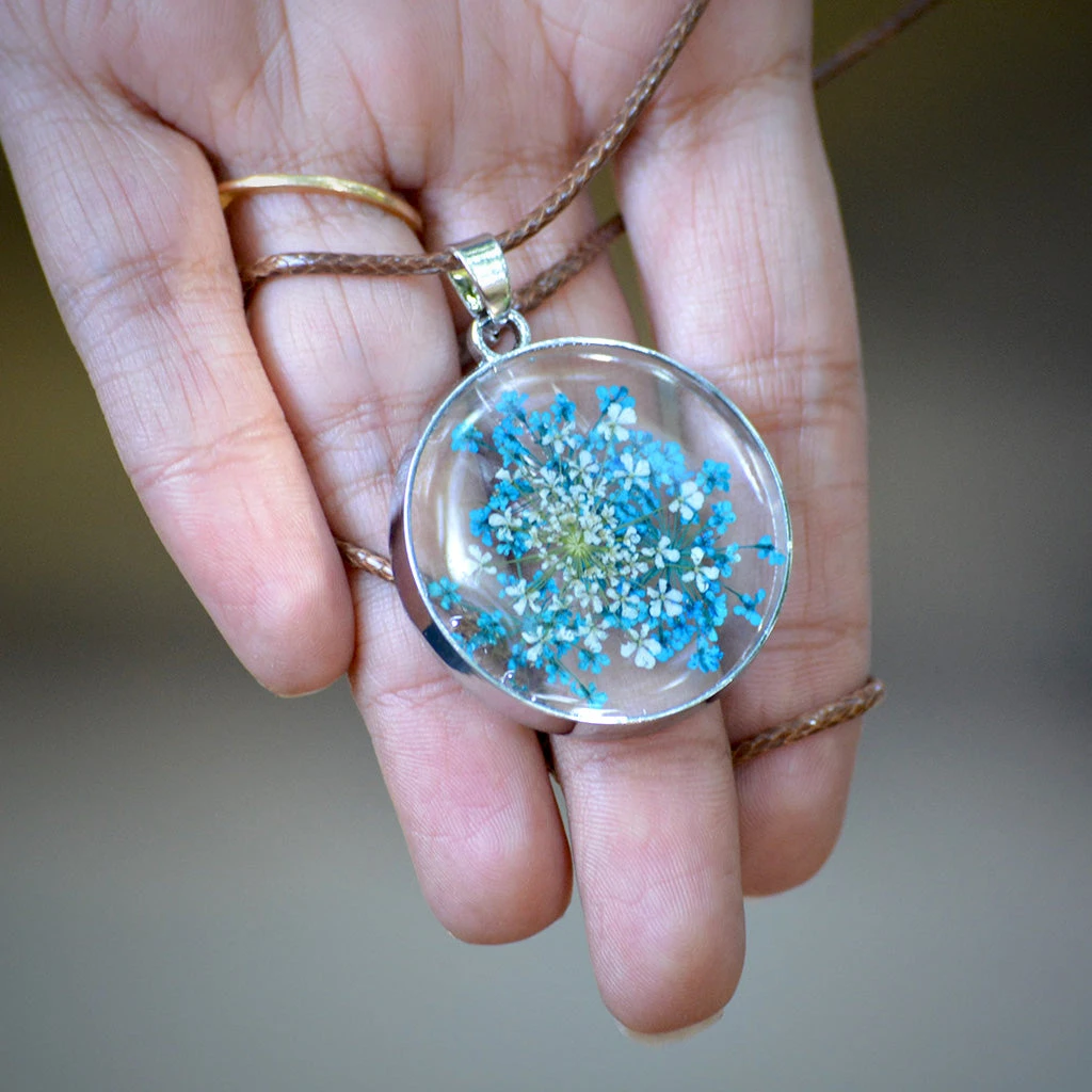 Inspired by the ocean, A Briny Splash captures blue‑hued dried flowers in resin. Handcrafted and eco‑friendly, it’s a coastal‑chic accessory for any outfit.