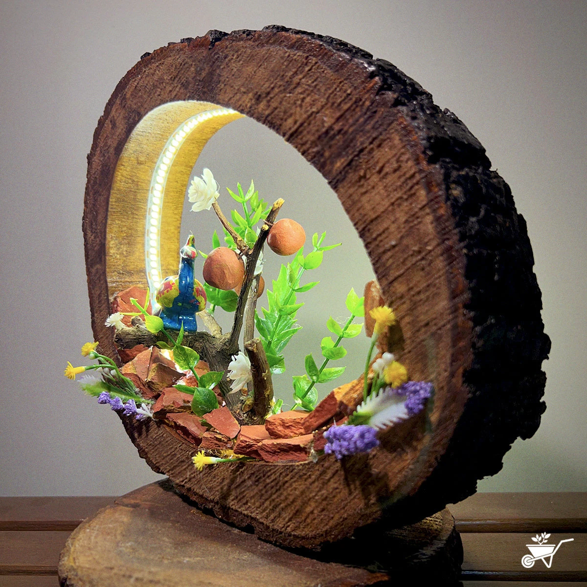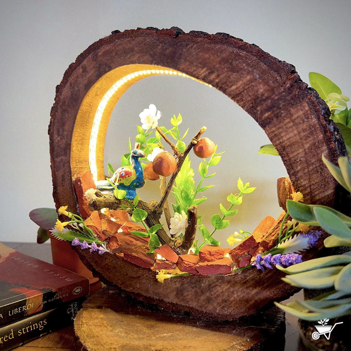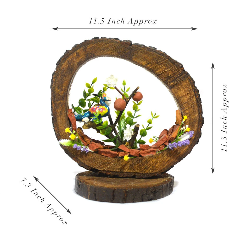 Material used : Wood, Artificial Flowers, LED Light, Terracotta pieces, Peacock Miniature