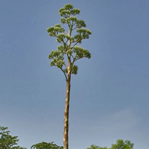 The massive flower clusters (1-2 m long) are borne at the top of a very robust flowering stem. These flower clusters have 10-20 branches, with the branches being further divided towards their tips (i.e. they are terminal panicles). Individual flowers are borne in an upright (i.e. erect) position on short stalks (i.e. pedicels). These greenish-yellow flowers (5-6.5 cm long) are borne in groups towards the tips of the branches. They have six ‘petals’ (i.e. perianth segments or tepals) that are fused together at the base into a short tube (8-16 mm long) with spreading lobes (18-24 mm long). The flowers also have six very large stamens, consisting of stalks (i.e. filaments) 3.5-4.5 cm long and yellow anthers (20-30 mm long). They also have a large ovary topped with a style and three stigmas.