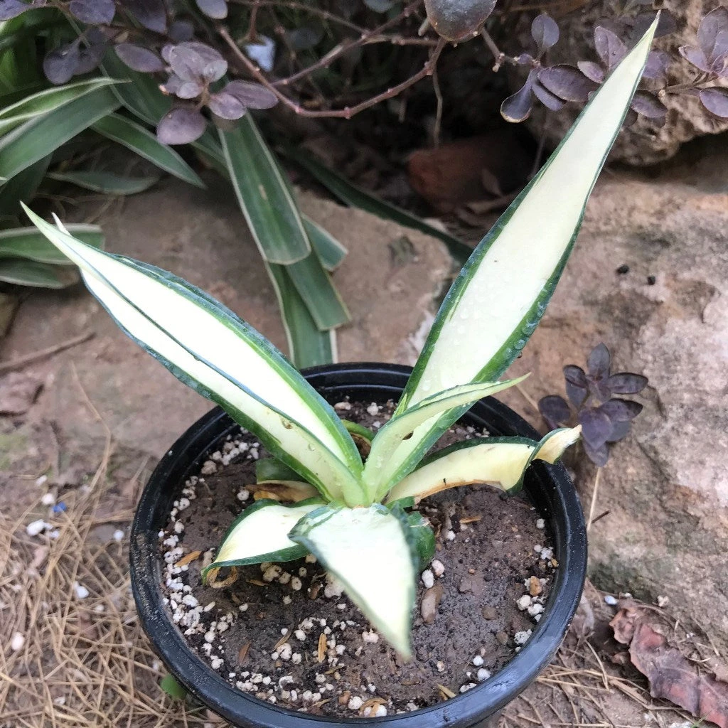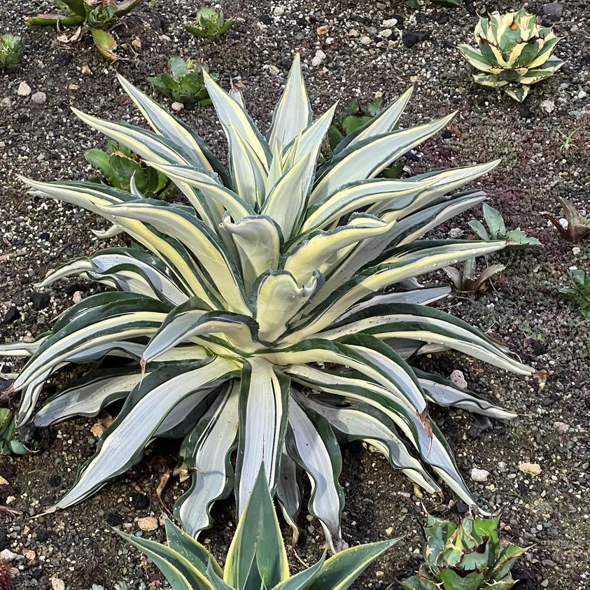 Agave Desmettiana βQuicksilverβ is a very striking rosette-forming Agave. This agave is a new color variation of Agave desmettiana.Β Quick Silver is distinguished by its bold and wide center stripe of creamy grey color, and the edges are of a medium green.Β It makes a stunning specimen plant with the graceful 2 feet long leaves, which curve upward and then out.