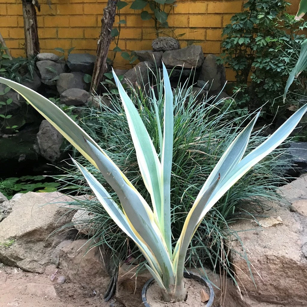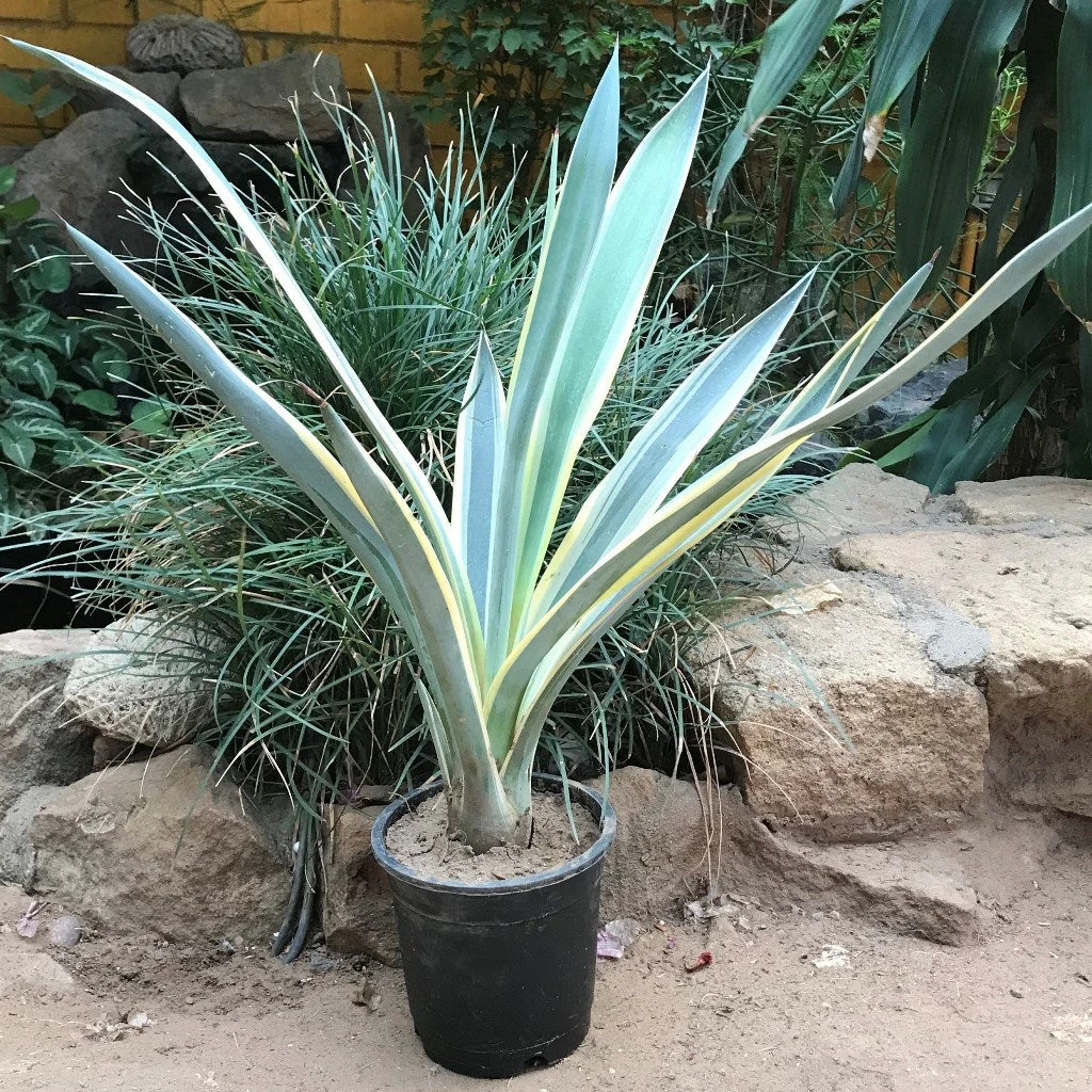 Agave tequilana ‘Sunrise’ is an attractive, medium to large agave, up to 5 to 6 feet tall, with open rosettes of narrow light gray colored leaves that have pale yellow bands along the small toothed margins. The leaves are gradually narrow at the tip and end in a sharp, dark brown terminal spine. Stiff, erect leaves are arranged in an open rosette. The green flowers with pink stamens are arranged along a branched inflorescence.