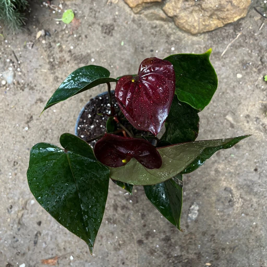Anthurium Chocolate beauty is a real eye-catcher even when not in bloom. It has stunning heart shaped, waxy leaves and very attractive deep, rich chocolate-burgundy with a glossy, lacquered texture flowers. Appears almost black in certain lighting. flowers.