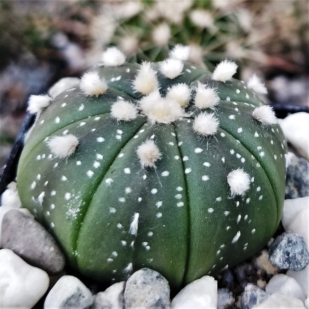 Sand Dollar Cactus, forms a flattened, round shape that is divided into eight sections and grows upto 3″ size. It’s a spineless cactus with a row of white fuzzy dots running down the center of each section. Smaller white dots form eye-catching patterns on the sections. Funnel-shaped pale yellow flowers bloom in the center of the cactus.