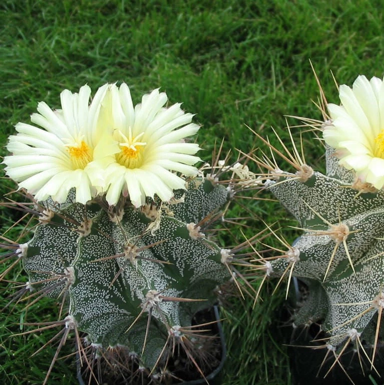 Astrophytum ornatum is the largest and tallest species of Astrophytum. Solitary and cylindrical in form it may grow up to 6.6 feet in height and up to 30 cm in width. It develops numerous white woolly flakes for protection from the sun. It flowers throughout the summer. Flowers are canary yellow and up to 7.5 cm long.