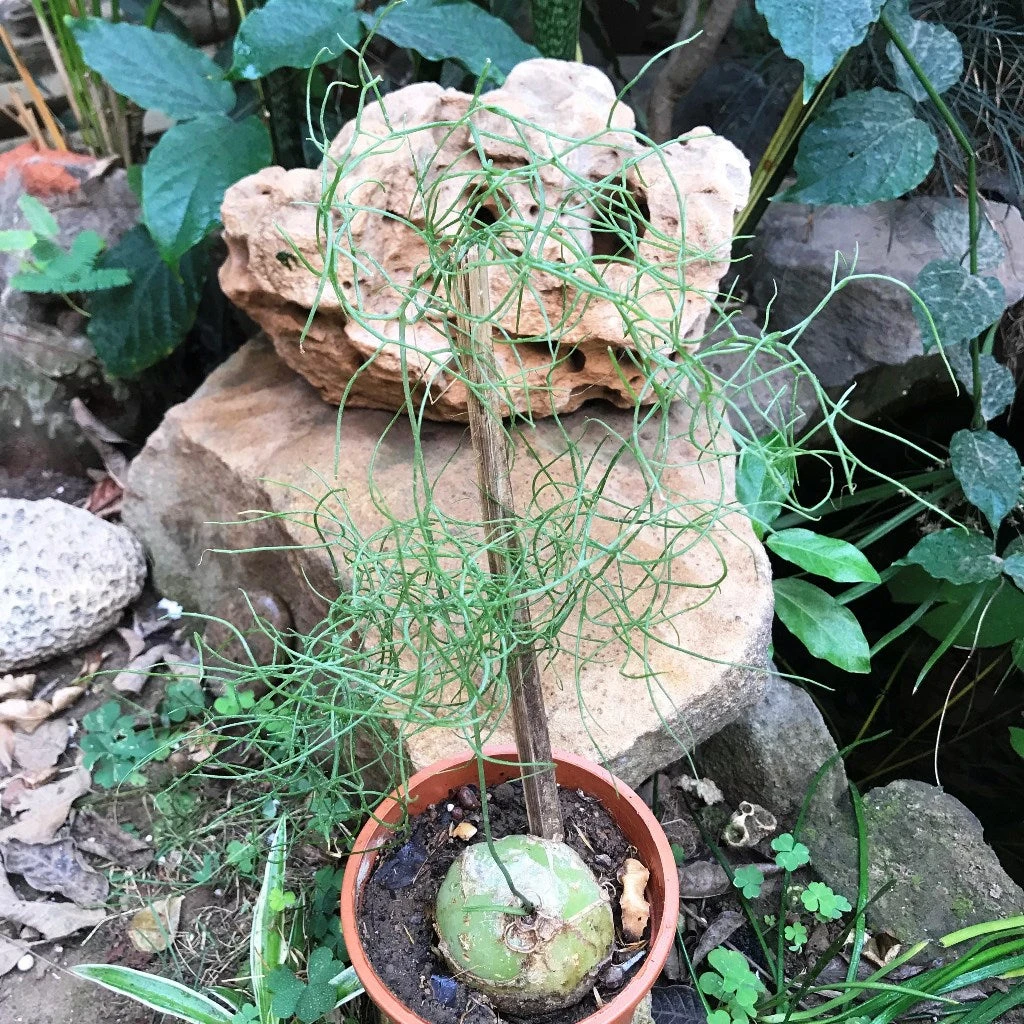Periodically, plants will produce long “vines”, which are actually the plantβs inflorescence, which in this species are intricately branched, and are either climbing or scramble along the ground and onto nearby plants. These “vines” can grow quite large (in some plants, upwards of 15 feet in length). These do not produce true tendrils or other structures which may anchor or attach the vines to other plants, so the vines can only stay in position by weaving their way through the stems of other plants. Stems are fleshy, bright green, much branched and function as leaves.