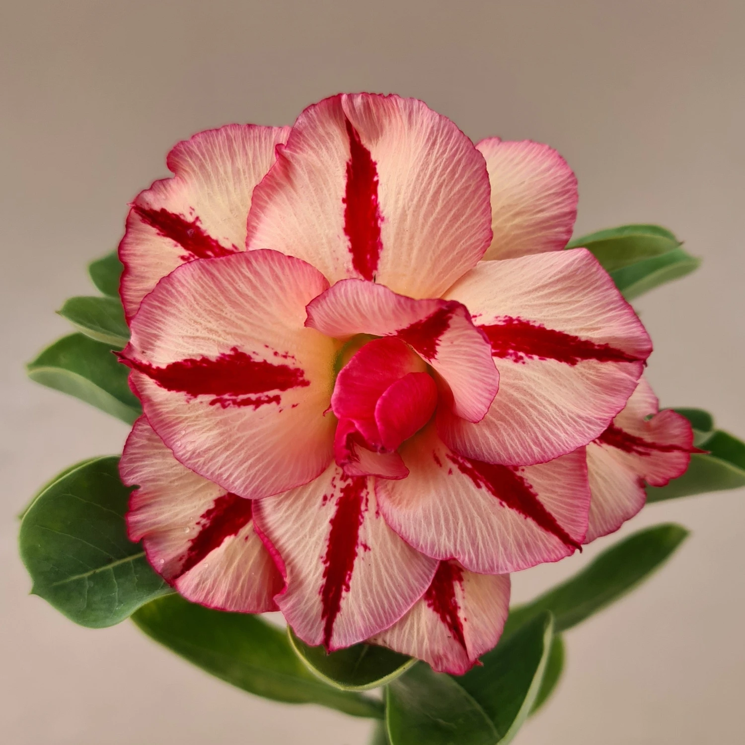 Coral Flame Adenium Plant boasts creamy-peach petals accented with vivid red starburst streaks and a fine pink edge, making each bloom a radiant showpiece. Rosy Adeniums have many spectacular hybrids. The basic culture is very similar to orchids