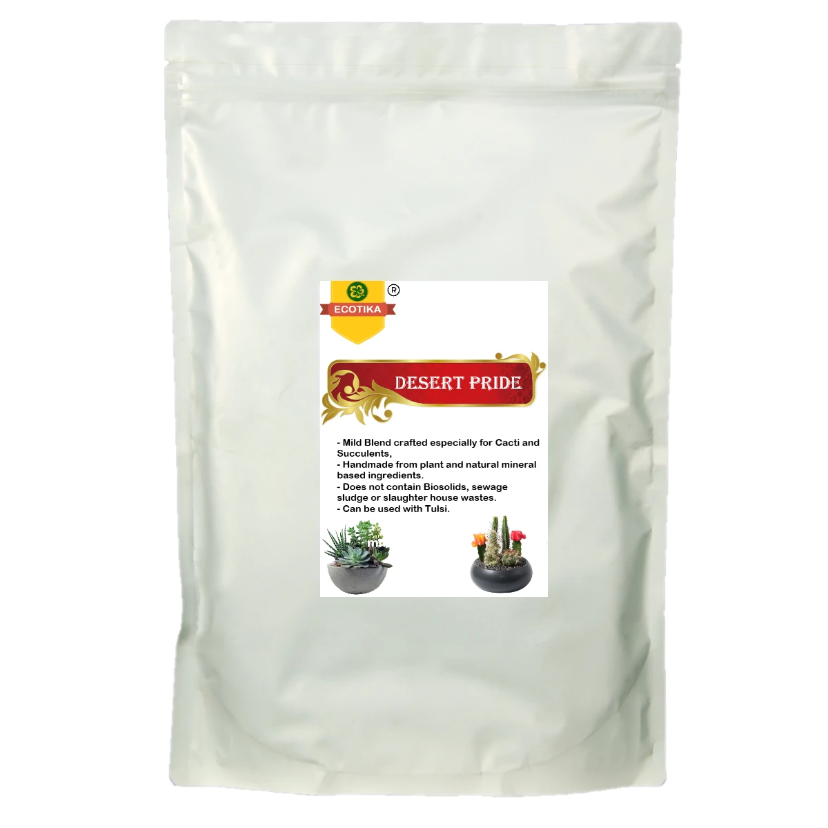 ‘Ecotika’ Desert Pride is a Low nitrogen blend (containing Alfalfa) specially crafted as a fertilizer for Cactus and Succulent, provides necessary primary, secondary and micro nutrients, promotes earthworm population thereby enriching soil micro environment. Since this is a Slow to moderate release fertilizer the nutrients are released after some time approx 10-15 days but at an uniform rate and over longer duration..