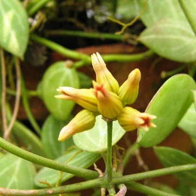 Watermelon Dischidia have striped tiny 1/2″ leaves, dark green and white. The beautiful foliage resembles little watermelons. The flowers are greenish-yellow with purple lines, but this plant is grown for it’s beautiful leaves. When Dischidia finishes blooming, leave the flower stalk, as it may produce new flowers. Removing the stalk forces the plant to produce a new stalk, which delays blooming and wastes the plant s energy.