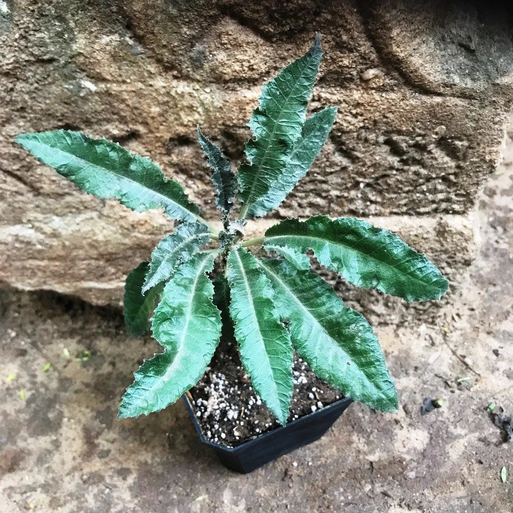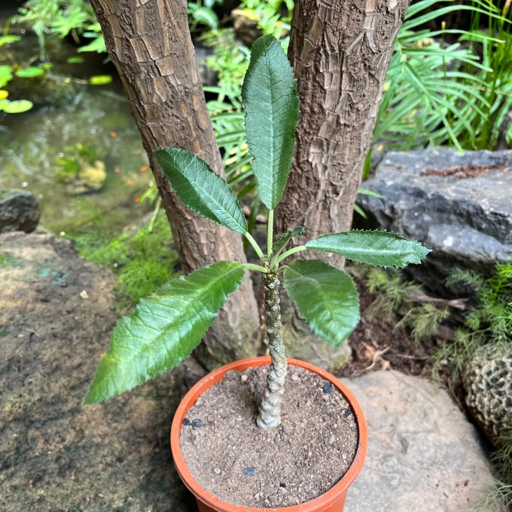 Dorstenia crispa a curious fig relative from Somalia. This species produces a caudex and has oblong leaves that flush a burnt orange color in high light or when temperatures drop.Β It has a thick, dark green- to mahogany-colored conical trunk, that will grow to 15 centimeters in diameter and 30-40 centimeters in height, older parts often with peeling bark. The stem bears conspicuous and prominent round scars of petioles, inflorescences and stipules in a spiral pattern.