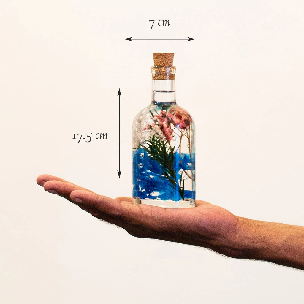 Material Used : Glass Bottle with Cork, Hydrangea, Love Bush, Rose Bud