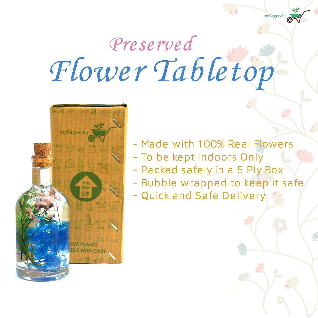 Our Preserved Tabletops are made with 100% natural Flowers & they last for 2-3 years. These are to be kept indoors only.