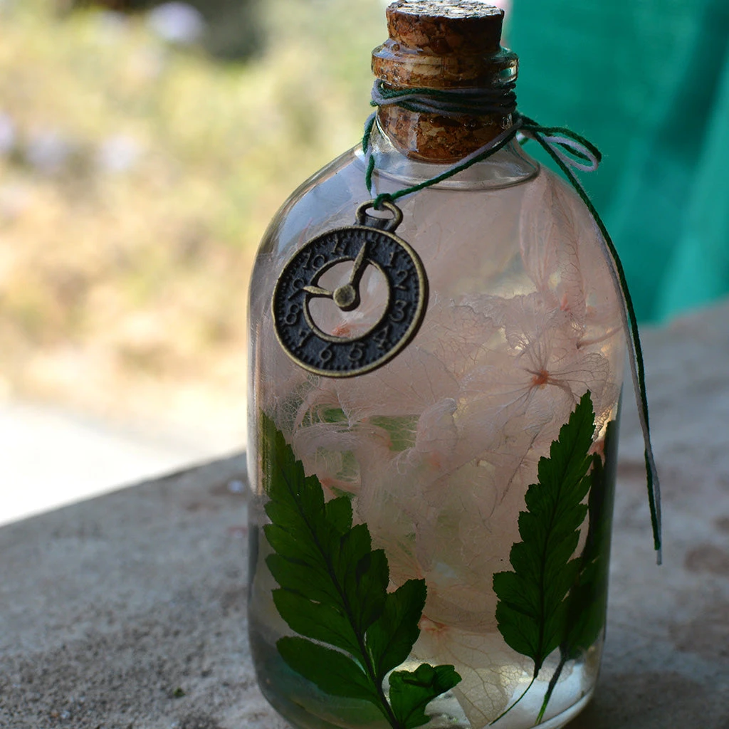 Material Used : Glass Bottle with Cork, Hydrangea, Fern, Clock Charm, Oil.