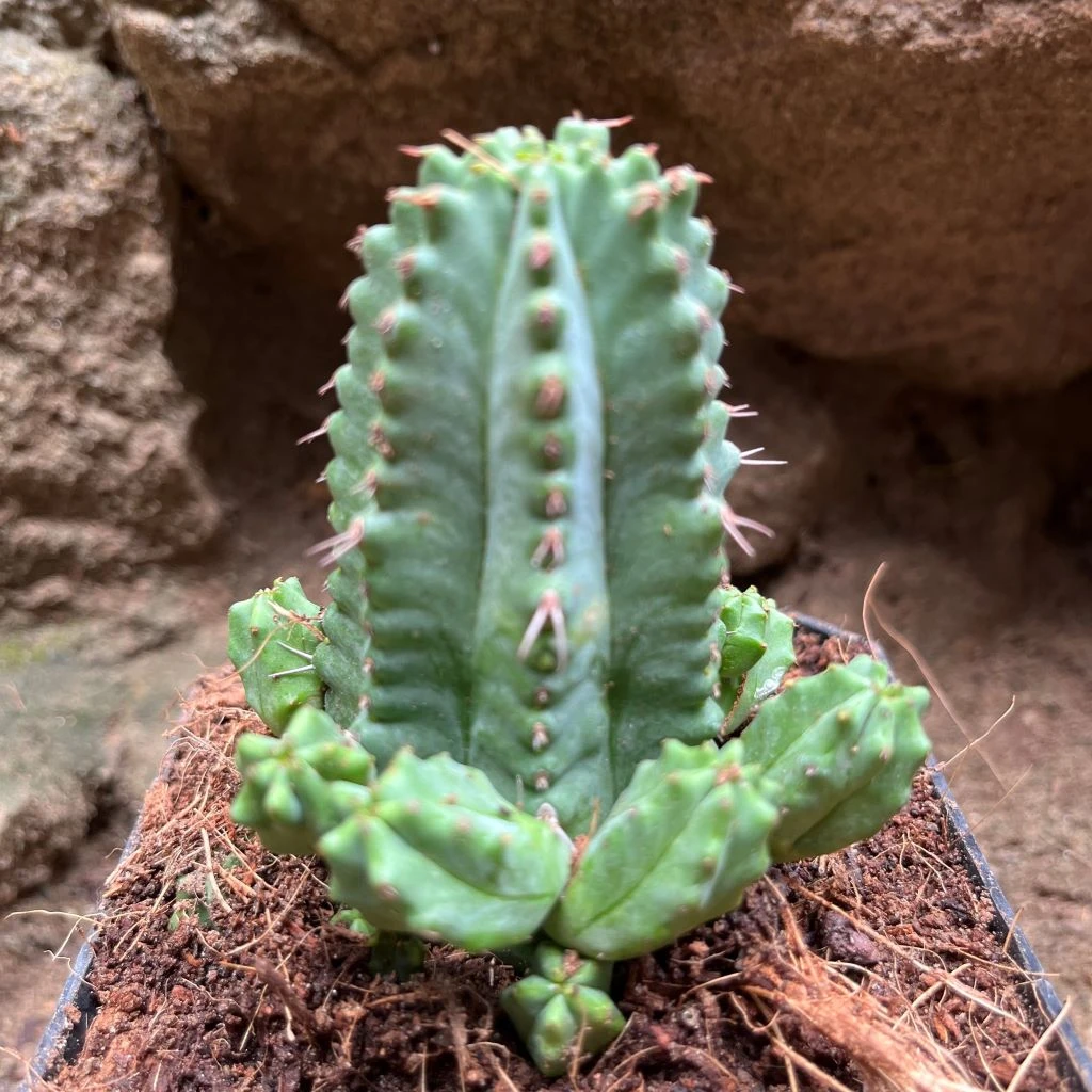 Euphorbia anoplia, is a small clumping succulent that resembles a spineless cactus. It grows up to 1 foot (30 cm) tall, forming a colony of leafless ribbed stems that are usually somewhat variegated from whitish-green to green. Flowers are small dark burgundy and appear at the stem tips.
