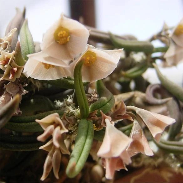 The branches are erect, ascending-spreading or decumbent at the circumference, which look like a bunch of octopus tentacles and twist over each other to form a rather lumpy hemispheric cushion. The leaves are in tufted rosettes at the tips of the branches, dark reddish-green, fleshy, up 2,5-3 cm long, terete, 3 mm in diameter, deeply channelled on upper side and bent into a hook at the tip.