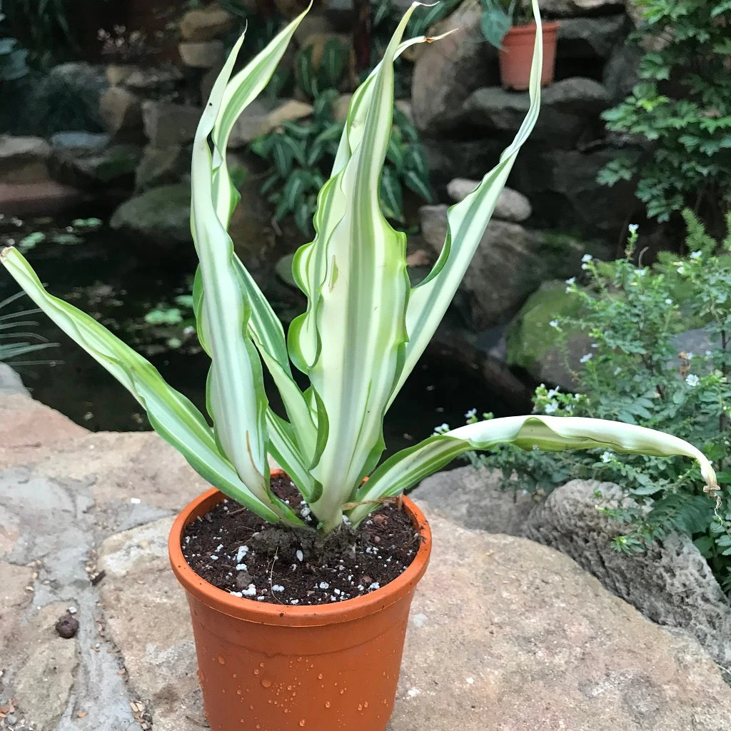 A short stem, or a stemless species, this plant has sword- shaped leaves with a broad base and a sharp pine at the top. Soft & not serrated, the luminous green leaves are adorned with a broad, decorative creamy-yellow strip along their center . This plant produces strongly scented white-cream and green flowers that is attractive to bees. Flowers are followed by small Cactus that cover the inflorescence as the basal plant dies as this plant is monocarpic . While it doesn’t offset or form pups, it produces abundant plantlets along the bloom spike that can be replanted for continuing presence of the beautiful plant.