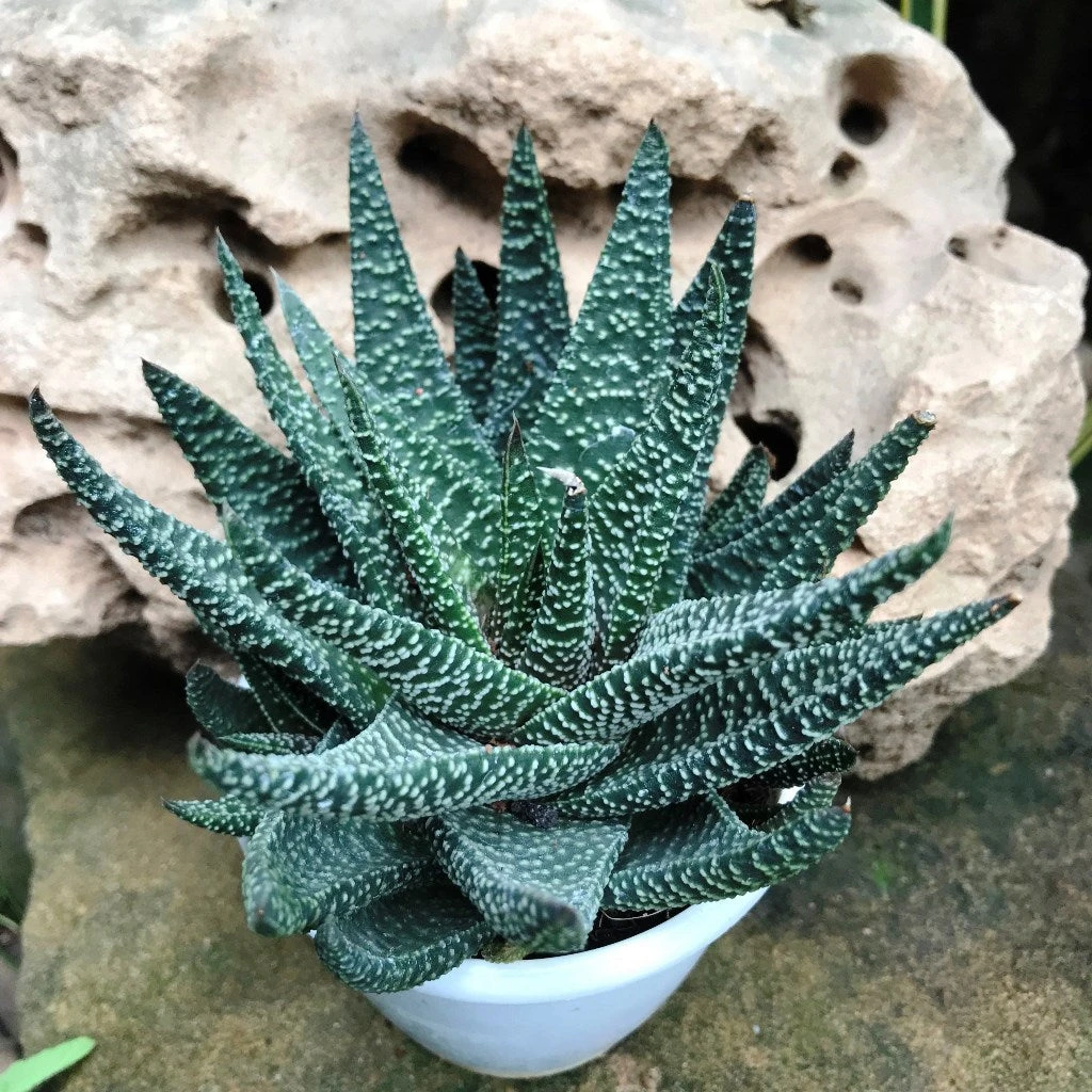 Gasteraloe ‘Royal Highness is a rare intergeneric hybrid of cross between Gasteria batesiana and Aristaloe aristata, formerly known as Aloe aristata. It is ornately decorated with a dense smattering of raised white dots & grows up to 5-40 cm in height. It has short pointed and triangular leaves that make the plant look even more attractive.Moderate stress from bright light and drought can induce flushing of orange and red tones.