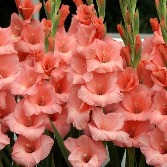 Gladiolus ‘Jessica’ is a timeless and elegant variety featuring delicate coral-pink flowers that exude warmth and sophistication. The blooms are sizable, evenly shaped, and gently ruffled, displayed on tall, robust stems. Their clear, refined color brings a serene and romantic ambiance to gardens, wedding arrangements, and flower borders.