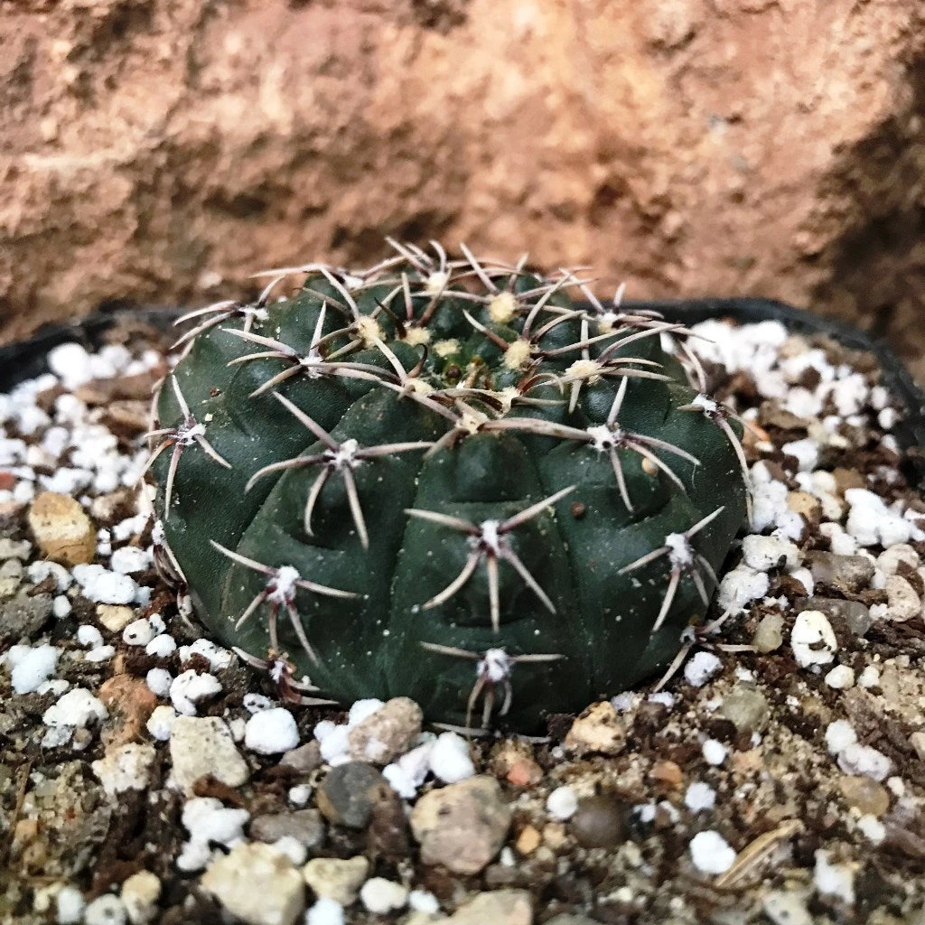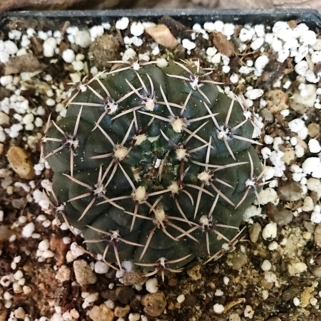 Gymnocalycium quhilianum is a spherical cactus with a swollen underground root system. The plant body hasΒ significantΒ chin humps below the large woolly andΒ peculiarΒ areoles. The plants typically got a dark greenish red-violet-brown body colour & grows to 5Β cm tall by 7Β cm wide, withΒ white spines and white, daisy-like flowers in summer.Β