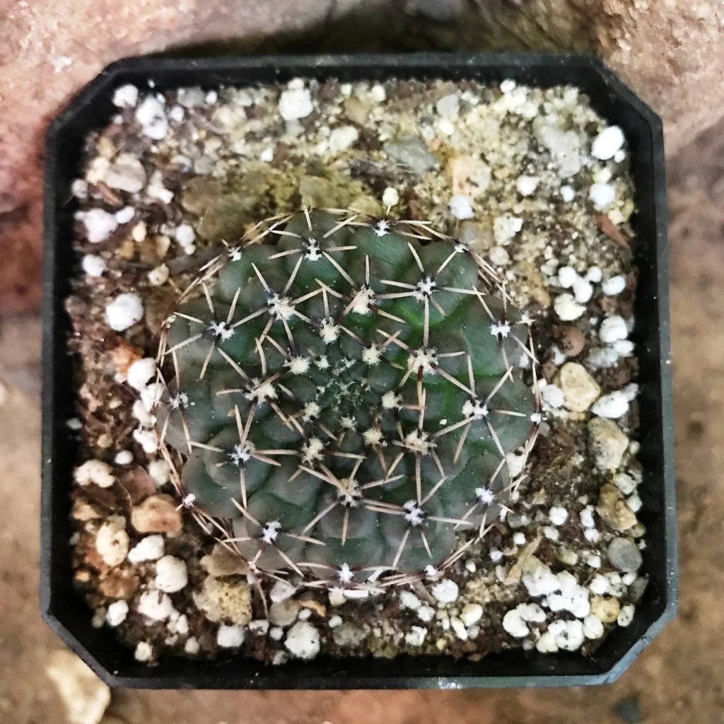 Gymnocalycium quhilianum is a spherical cactus growing to 5ย cm (2ย in) tall by 7ย cm (3ย in) wide, with ribbed stems bearing brown spines and white, daisy-like flowers in summer.