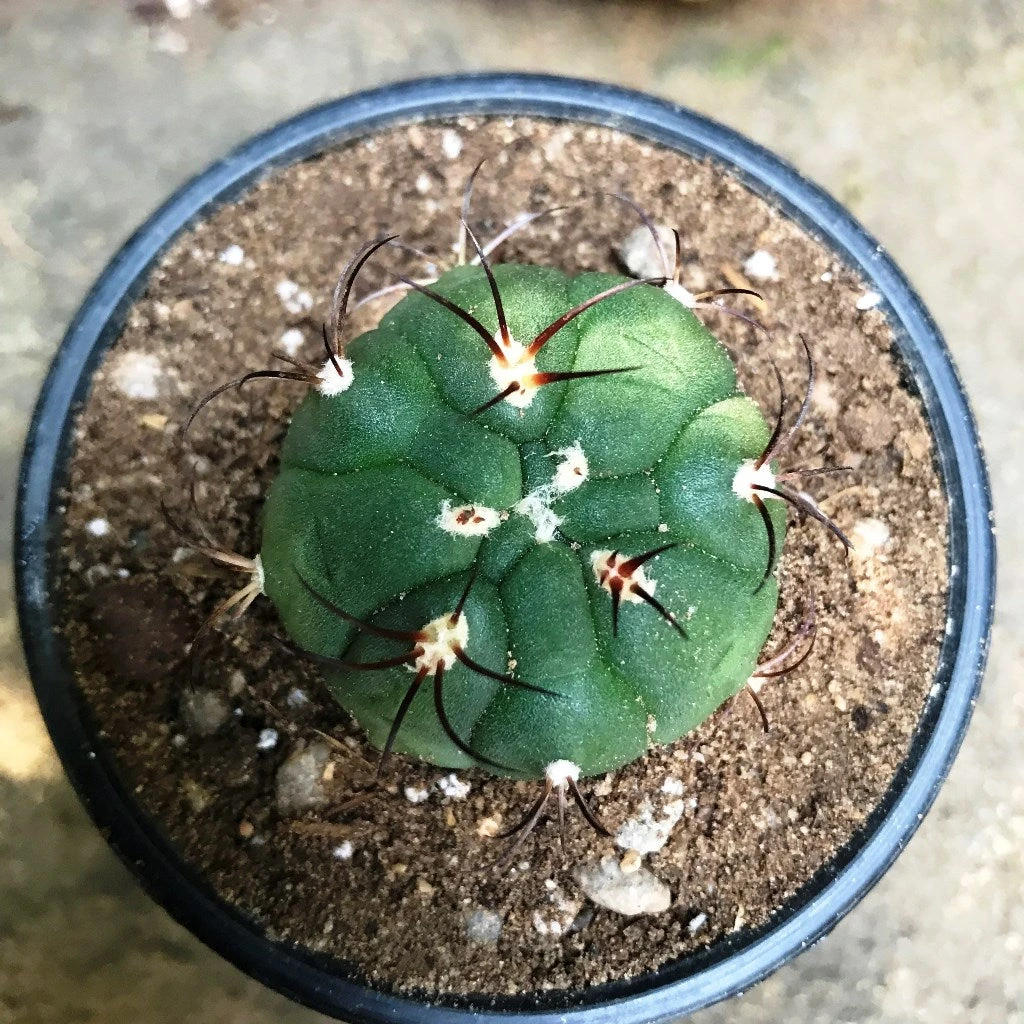 Gymnocalycium saglionisย is aย cactus with a solitary, spherical, more or lessย has flattened, globose with 10-30 or more tubercleย ribs, and clusters long, spreading and often curved spines that are white to rich brown in colour, contrasting beautifully against greyish green body of the cactus.