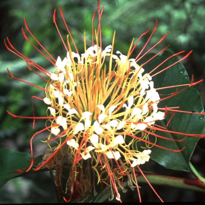 Hedychium ellipticum (Rock Butterfly Lily) is a clump-forming perennial with stems to 2.5 m in height, and glossy, lance-shaped, mid-green leaves 30-40cm in length. In late summer to early fall, very fragrant, creamy-white flowers appear in a dense flowerhead surrounded by a firework display of long, orange-red stamens. Rich with a pleasing spice fragrance, they resemble a brightly colored pin-cushion. Rock Butterfly Lily is one of the hardiest gingers. A beautiful foliage plant that is much admired when in bloom