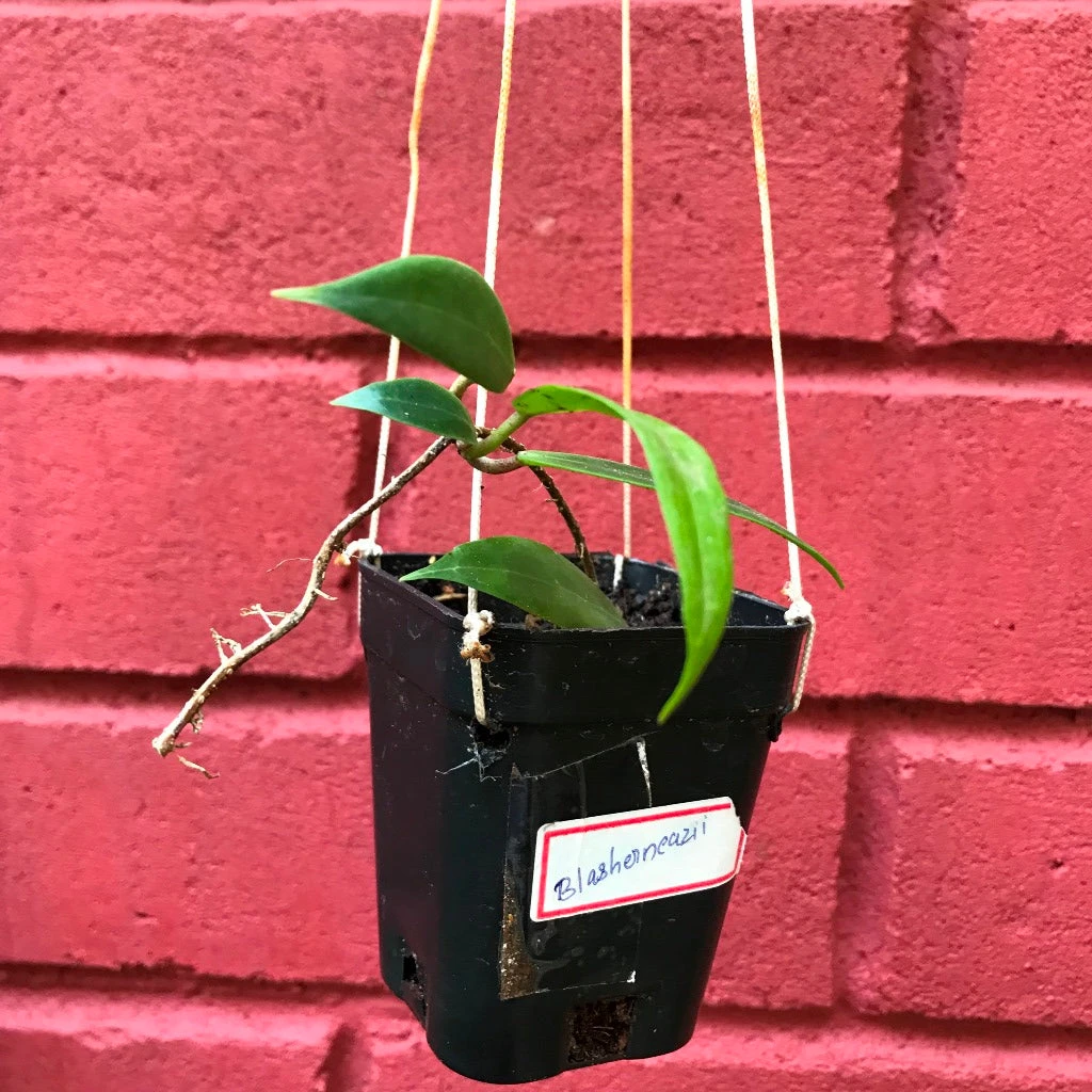 Hoya blashernaeziiย is a tropical, climbing plant that bear attractive foliage and cupped yellow blooms. The peduncles are long and thin and the drooping flowers can be hard to see in detail unless you are looking from below.