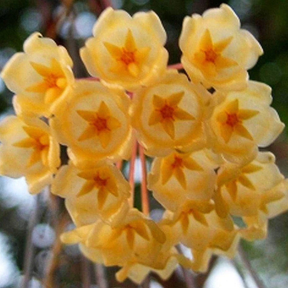 The flowers are cup-shaped, radially symmetrical and pentamerous ca. 1.5 cm in diameter and almost scentless, they have both the corolla as the crown in soft yellow hue and a shiny waxy texture. Peduncle to 12 cm long, pretty long for a Hoya.