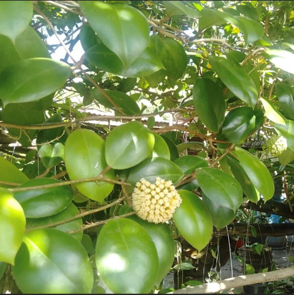 Hoya Incrassata, commonly known as the Waxvine or Common waxflower is a popular plant grown for its attractive glossy foliage, and sweetly scented wax-like yellow flowers with cerise inner markings under the white corona. The leaves on this hoya vary a lot in size. Anywhere between 9-16 cm long and 4-6 cm wide. These leaves are all green, have no flecks and they are somewhat “folded” along the center vein. Leaves are quite shiny when young, but get harder and not so shiny (and I don’t mean dust!) as they get older. Some leaves get thicker than others and these are also quite lighter in colour
