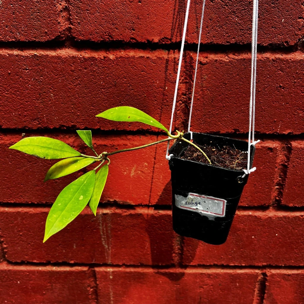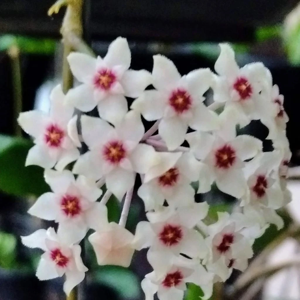 Hoya Sahya bears clusters of sweetly scented white flowers with purple centres. The magnificent pendant star-shaped Hoya bella flowers appear in small flat clusters of up to 10 flowers each.