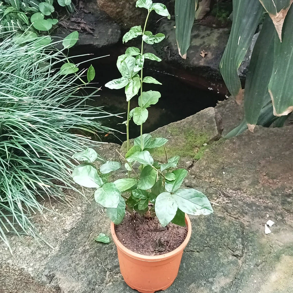 Butt Mogra is a slow growing Jasmine but grandest of them all with the largest flowers. Up to 1.5″ double flowers look like miniature roses. This tall growing shrub has Gardenia type flowers as large as carnations. Due to certain phenomena the older plants seem to be even more fascinating in providing flowers of different shapes and sizes on the same plant at the same time. The flowers do not seem to drop off and in most cases will dry right on the plant. This bushy compact plant needs a little more special attention than other Jasmines. Butt Mogra is also used to flavor the jasmine tea and making perfumes. A perfect houseplant, Butt Mogra is a beautiful fragrant ever bloomer for your home and garden. Variety “Grand Duke Tuscany ” has bigger flowers and elongated leaves.