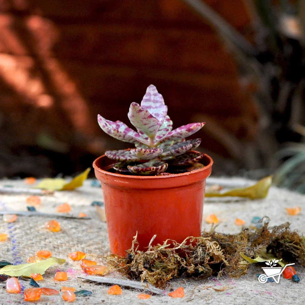 Kalanchoe humilis is a low growing succulent shrub, up to 3 feet (90 cm) tall with an open rosette of up to 4 inches (10 cm) long gray-green leaves that are strongly marked with maroon spots. The flowers are small dull purple to green in color and rise 10 inches (25 cm) above foliage on an upwardly branched inflorescence.