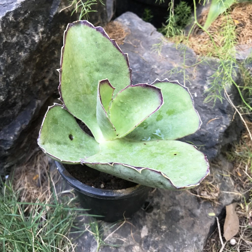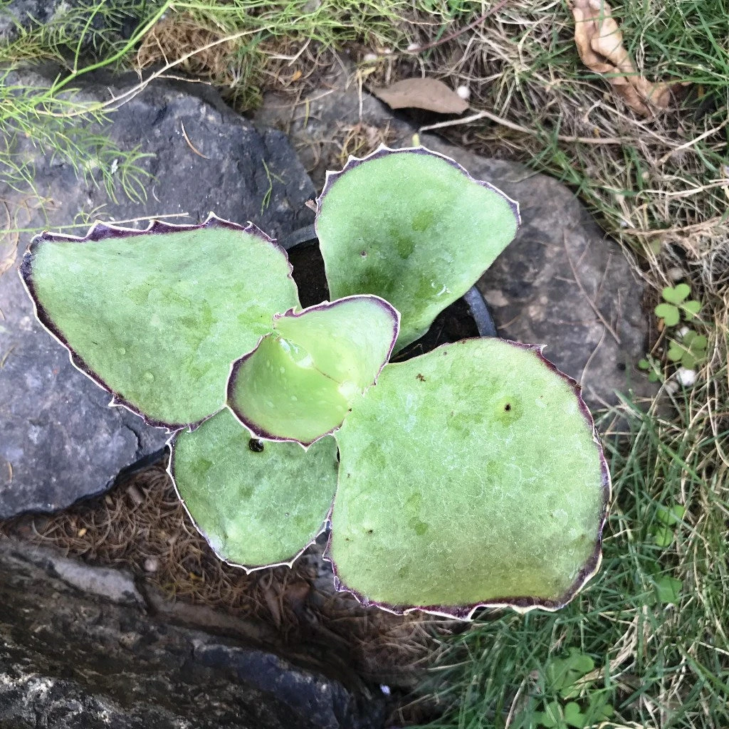 The fleshy leaves have pretty reddish purple margins. Plantlets will form at the ends of arching branches, and reroot where they touch the ground, allowing them to ‘walk’ away from their ‘mother’ plant, hence its common name ‘Walking Kalanchoe’. Creamy white blooms, with a touch of pink, appear in the spring.