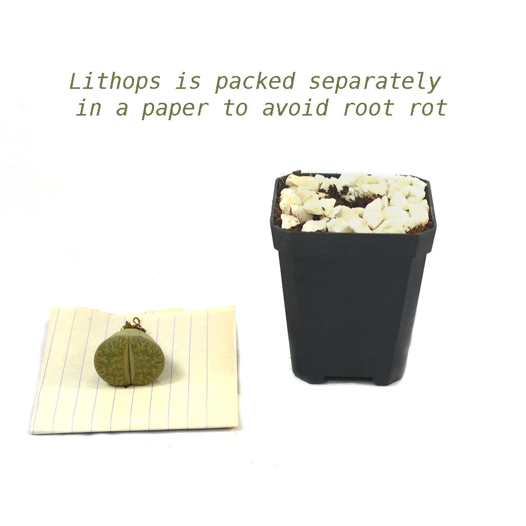 Lithops require a loam-based compost with the addition of extra drainage material such as horticultural grit or perlite. Position the plants in the soil so that about three-quarters of the height of the plant remains above the soil level to permit the plant to breathe . Collapse the hole around the taproot by carefully poking a pencil into the soil near the plant. Set a few pebbles among the plants and finally sprinkle a thin layer of coarse sand (or bird gravel) over the exposed soil.