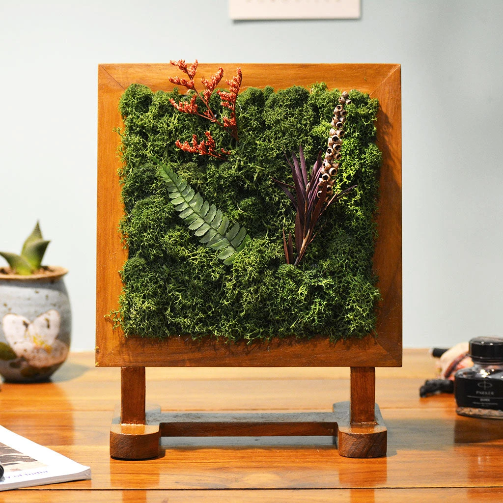 Find peace in Moment of Stillness. This handcrafted tabletop moss frame offers maintenance‑free greenery for a calming touch in any room.