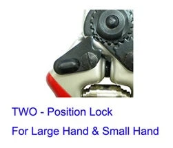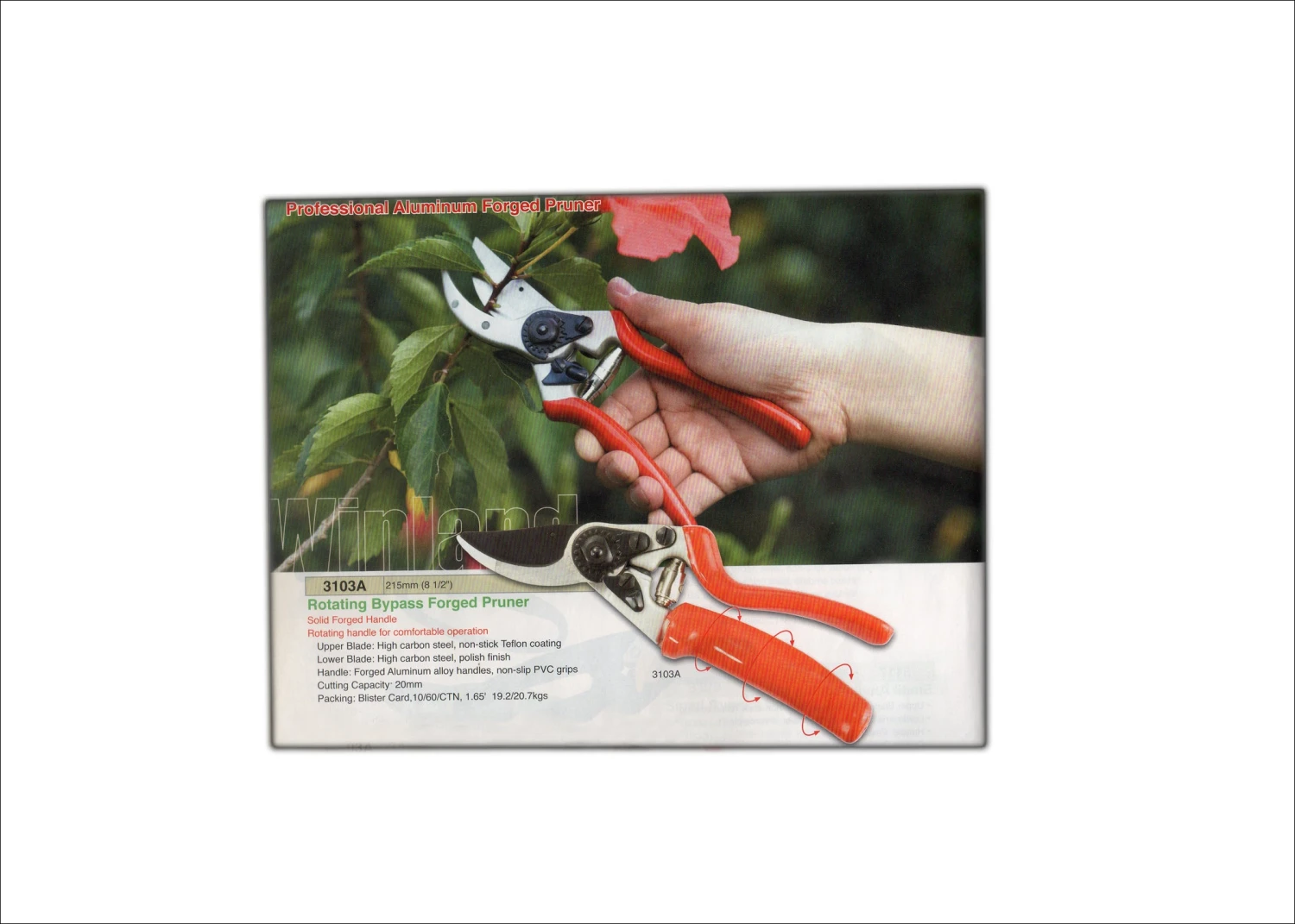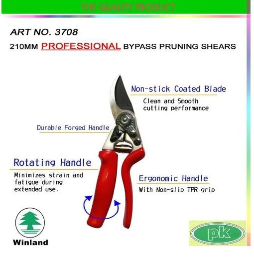 Auto-rotating aluminum drop forged handle with PVC grips is ergonomic design for long-lasting work. Adjustable Lock not only for large and small handle, but also for blade open size. The Bypass action makes it ideal for cutting tough living plants professionally, cutting cleanly without crushing branches or tearing bark. Size: 215mm (8 1/2″). Upper Blade: High Carbon SK5 Steel. Handle: Forged handle & Anodized finished with PVC grips