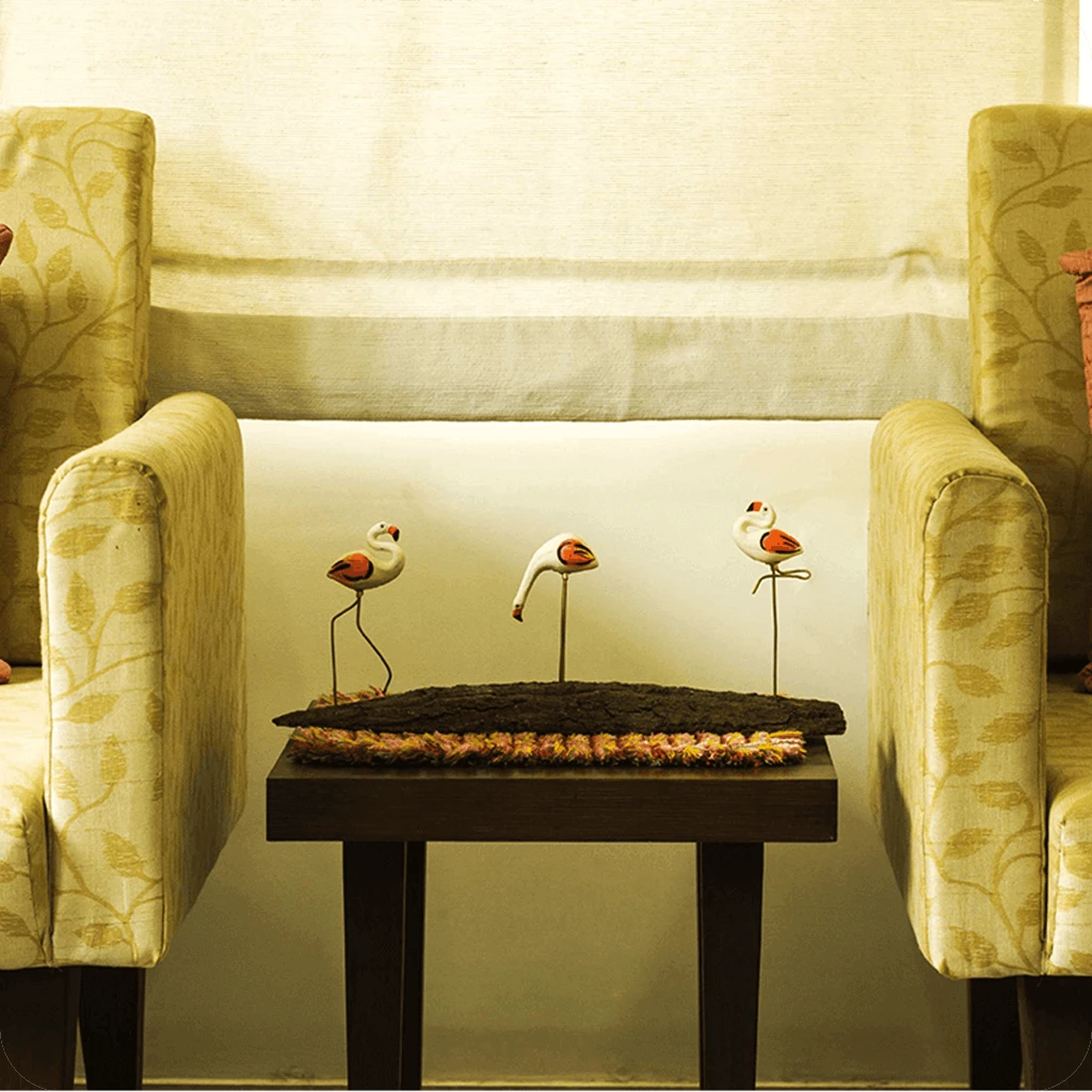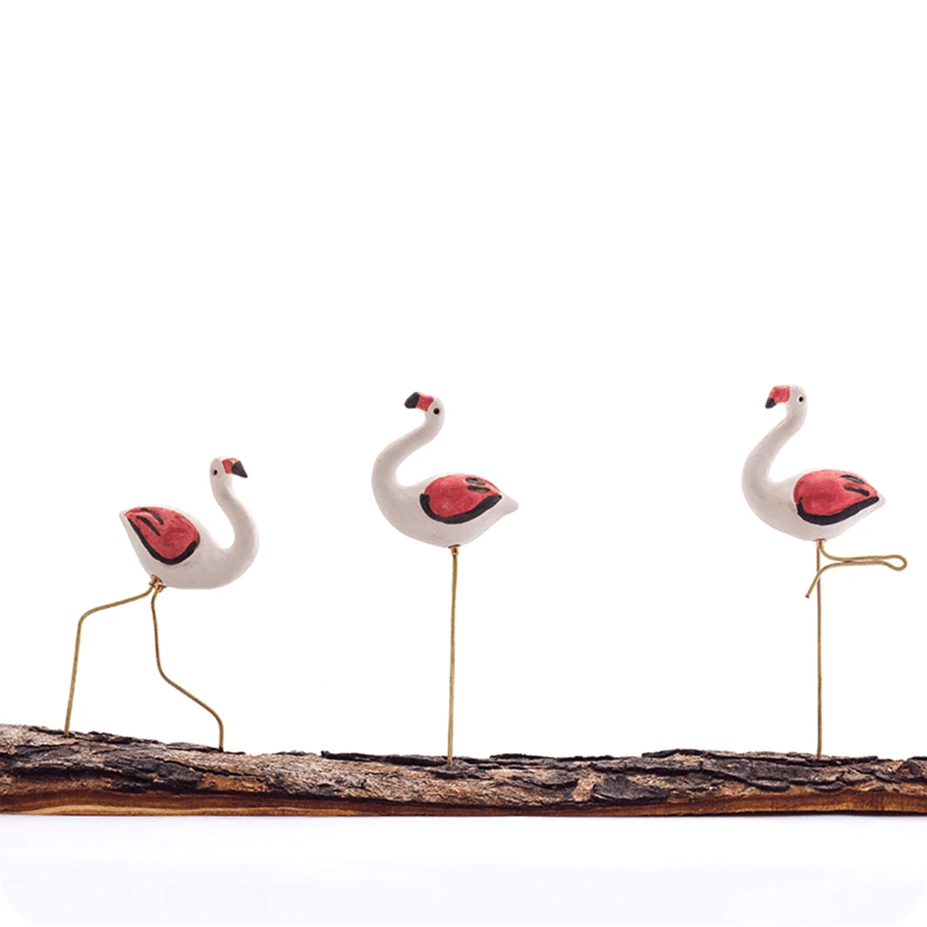 The finest of Thangadh clay moulded beautifully into a range of quirky flamingos define simplicity and endless appreciation to our surroundings. These weather-proof terracotta birds areย firmly fixed with natural wooden bark (seasoned, termite proof, matte lequireย coating) to be placed over any indoor / outdoor places