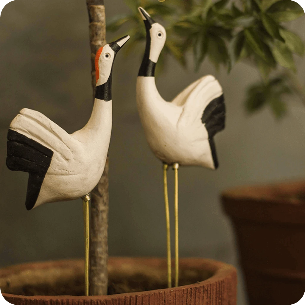 The finest of Thangadh clay moulded beautifully into a range of quirky Sarus Cranes define simplicity and endless appreciation to our surroundings. These weather-proof Ceramic birds have a bent wire to be firmly inserted into the soil for an indoor/ outdoor placement.