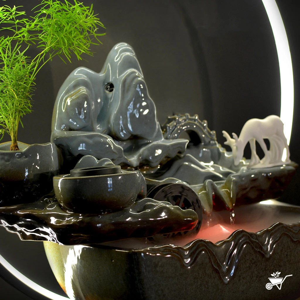 Set against a softly glowing LED halo, the cascading water mimics a gentle woodland spring, creating a soothing ambiance for any space. The intricately designed ceramic basin and rugged rock formations give it a natural, earthy charm, while the delicate bonsai and mist effect add an ethereal touch.