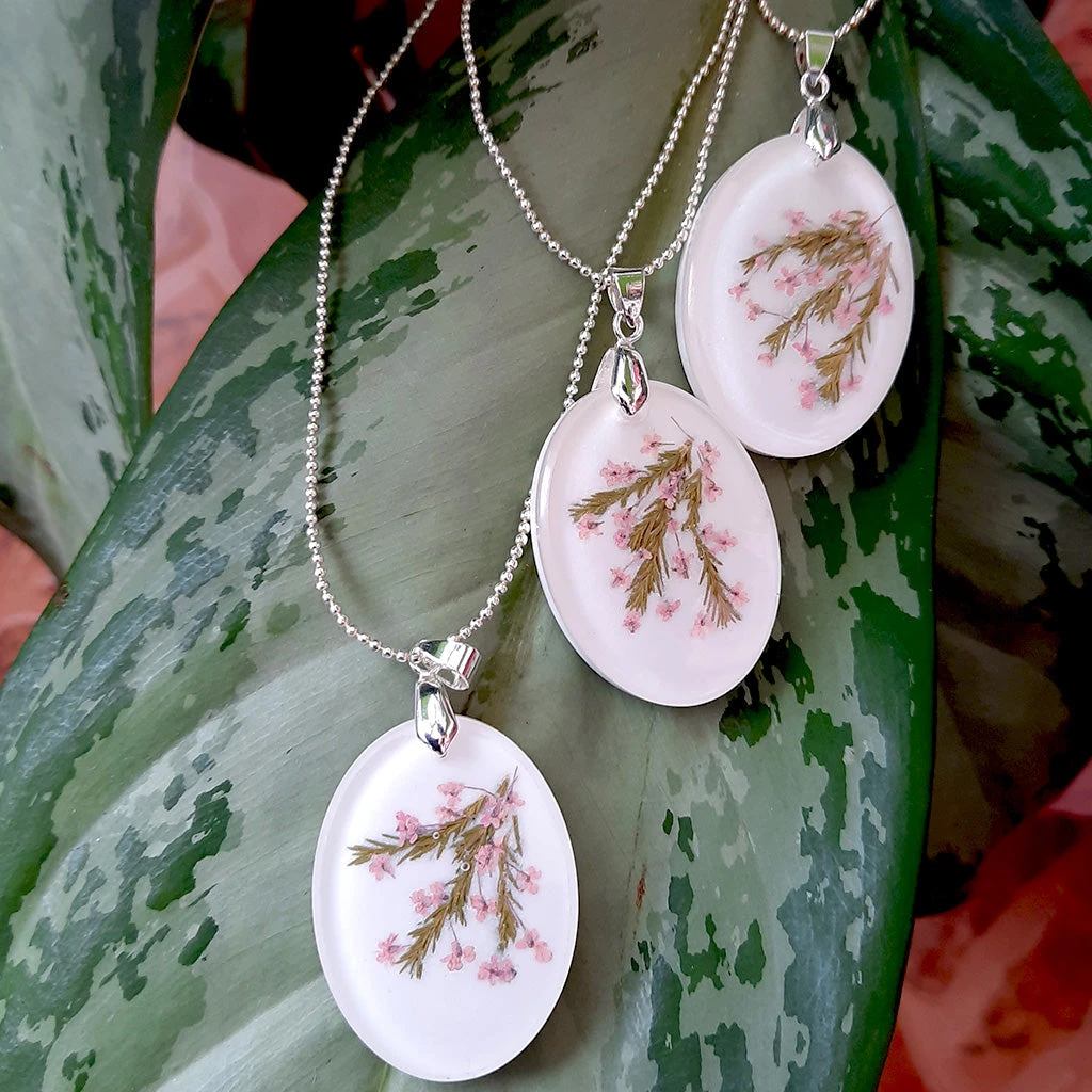 This exquisite pendant made with pink wild flower is a symbol of love, peace and tranquillity. Start your day with this blossom beauty and you will notice a smile on your face when you wear it.