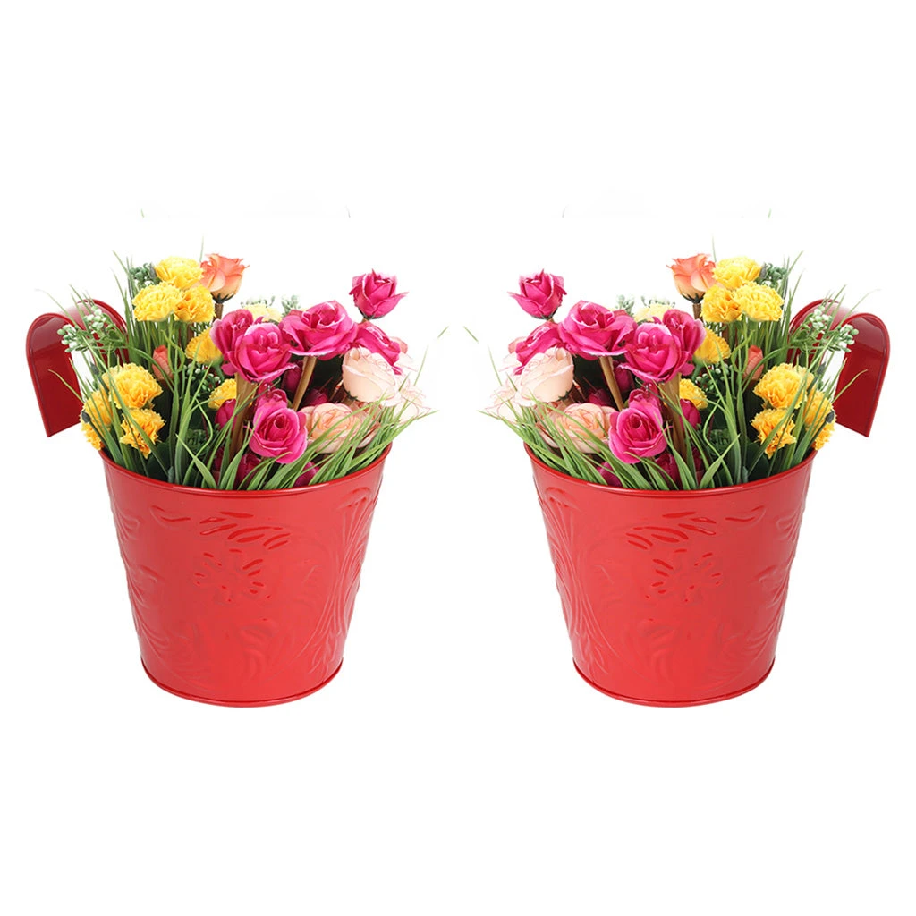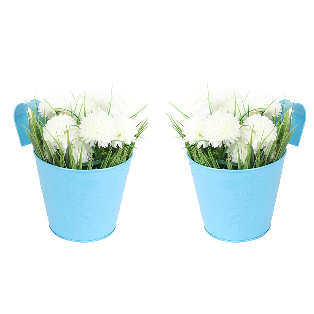 A set of 2 embossed metal pots coming with a hook perfect to hang in your balcony railing!