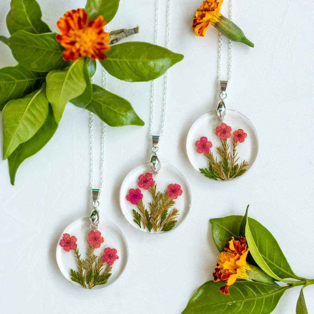 Material: dried flower, non-allergic metal alloy pendant clip, polyepoxides