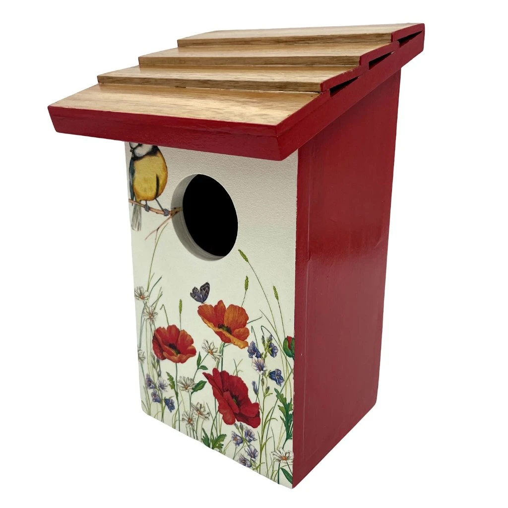Made in Medium-density fiberboard wood, it comes with a poly urethane coating giving it water resistant smooth finish. This bird house is sure to catch the attention small birds around your home. Beautifully designed bird house with bright flowers adorning the front of the bird house. It has an eye catching Teak Roof design.