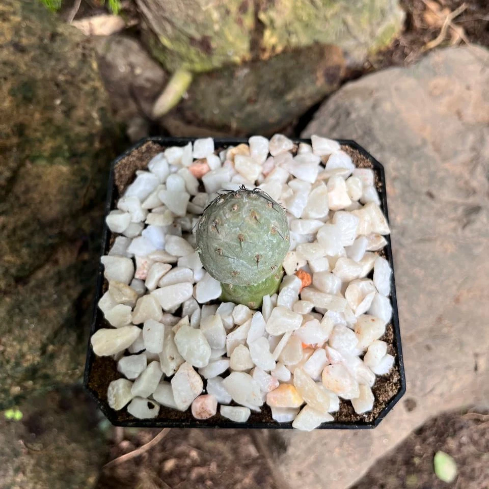 Tephrocactus geometricus is a rare cactus valued by enthusiasts for its distinctive spherical segments and elegant flowers. Its smooth, bluish-green to gray-green joints form geometric clusters, giving it a unique structure. This slow-growing plant develops small clumps, with each segment capable of detaching easily for propagation.