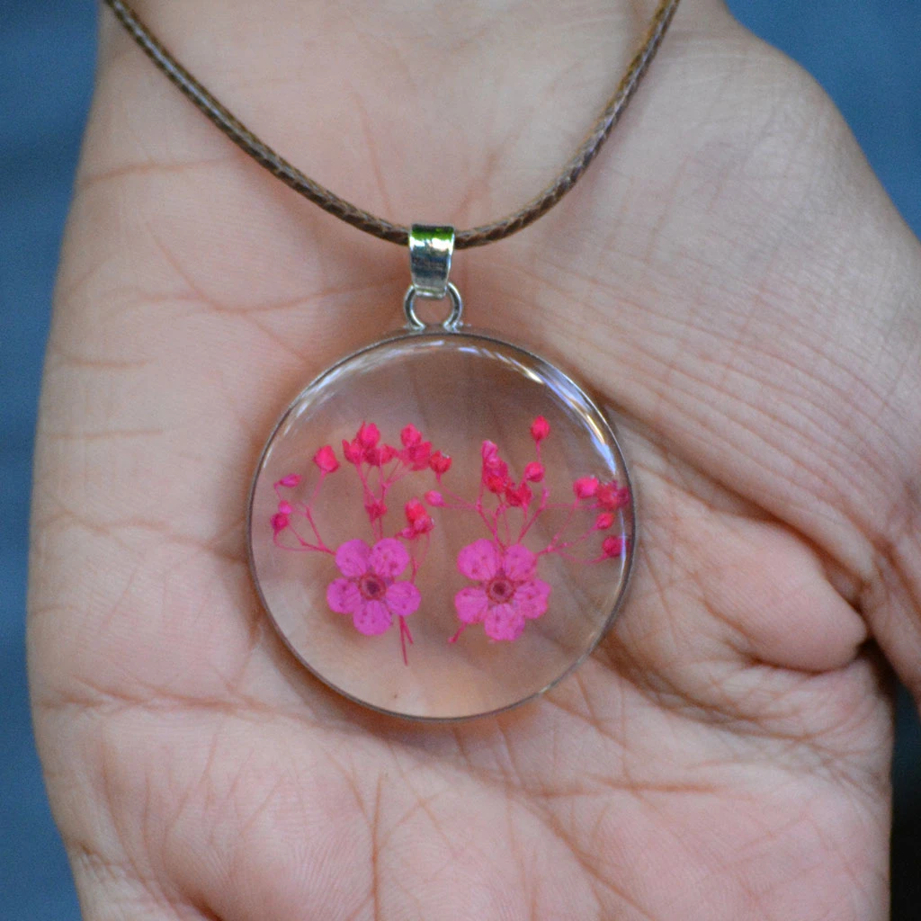 The Twin Fuchsia Necklace focuses on the elegance and simplicity of the gorgeous Myosotis & Gypsophila flowers. The twin shades of pink make it a delight to adorn.